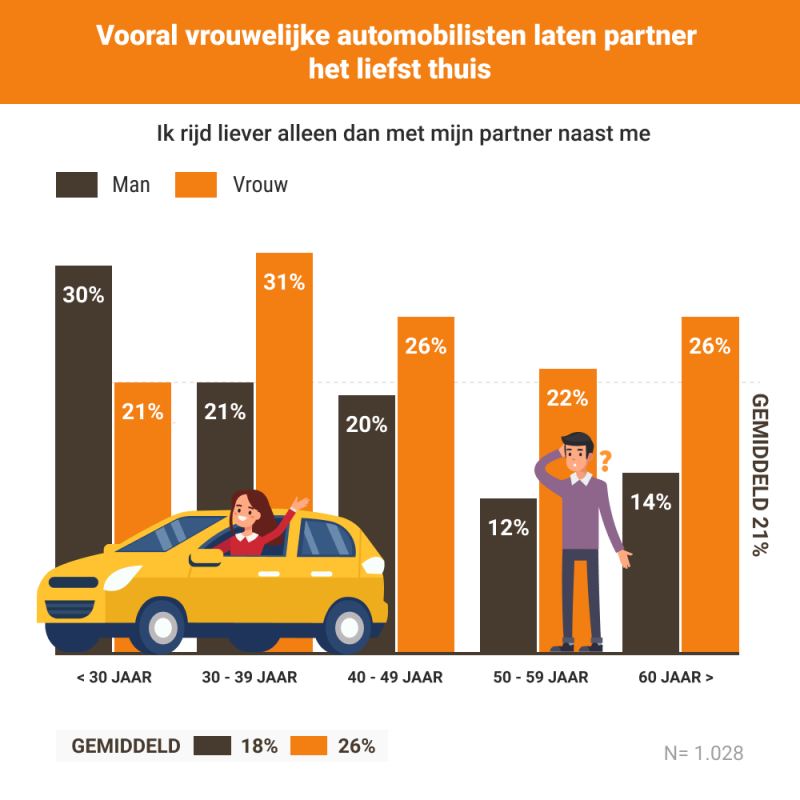 Maar liefst 21 procent van de Nederlandse automobilisten rijdt liever alleen dan met zijn of haar partner erbij. Dit blijkt uit onderzoek van RDWdata.nl onder 1.028 Nederlandse autobezitters, uitgevoerd door PanelWizard. Eenmaal zelf op de bijrijdersstoel, vindt een derde van alle ondervraagden het moeilijk om geen commentaar te leveren op de rijkunsten van zijn partner.